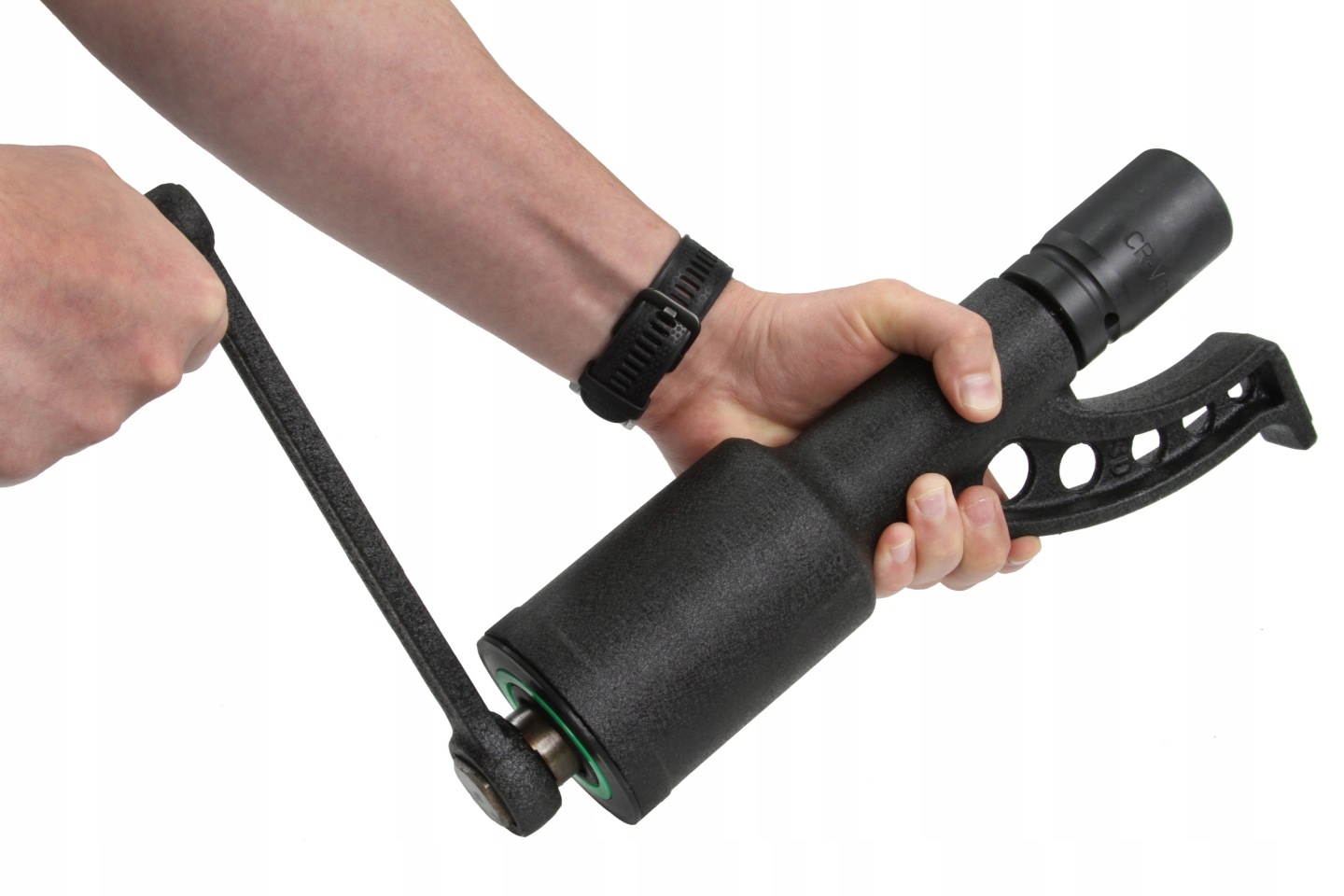 Po poluzowaniu kluczem planetarnym szpilek w kole i podniesieniu auta podnośnikiem, wystarczy połączyć korbę z dołączoną w zestawie przedłużką i nasadką, a następnie można przystąpić do szybszego wykręcania poluzowanych nakrętek/śrub – w ten sposób uzyskujemy konfigurację z przełożeniem 1:1