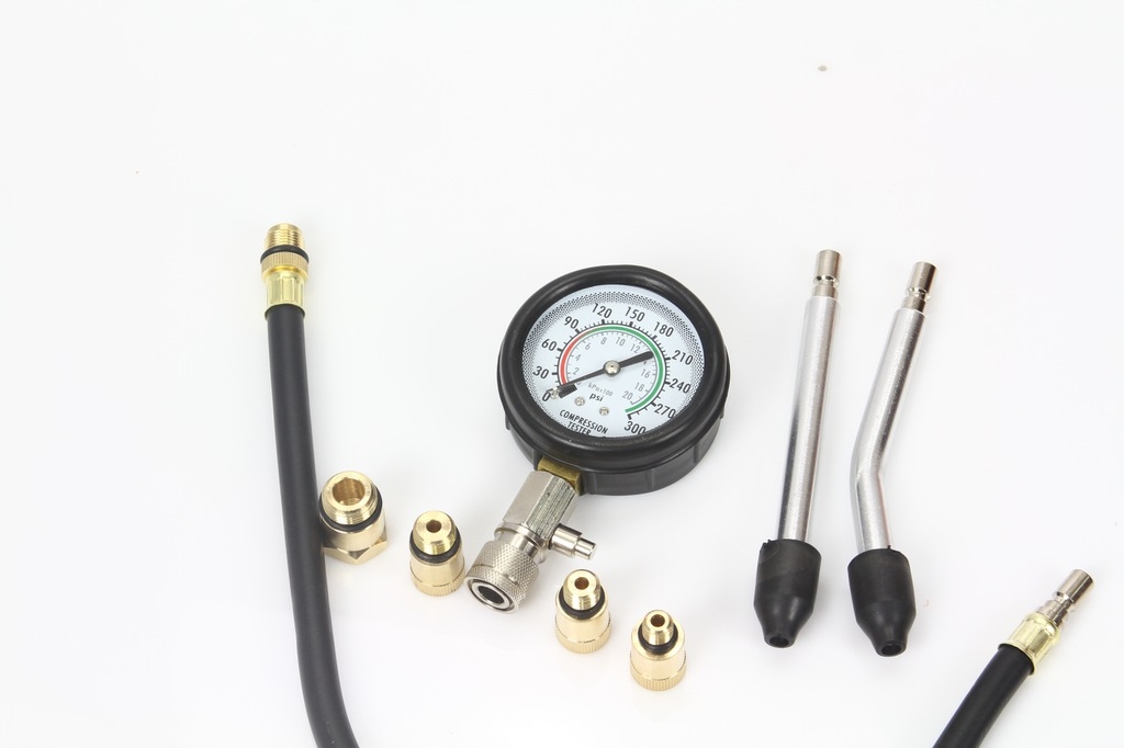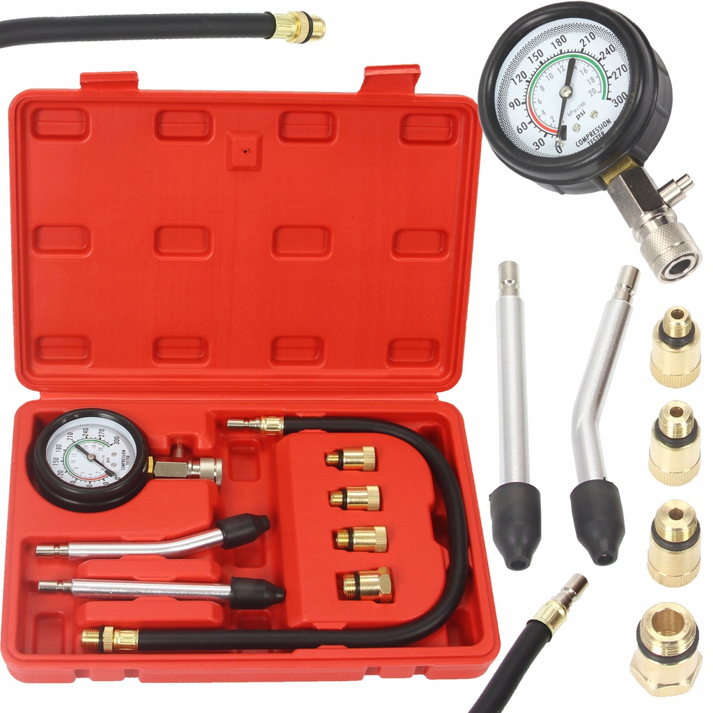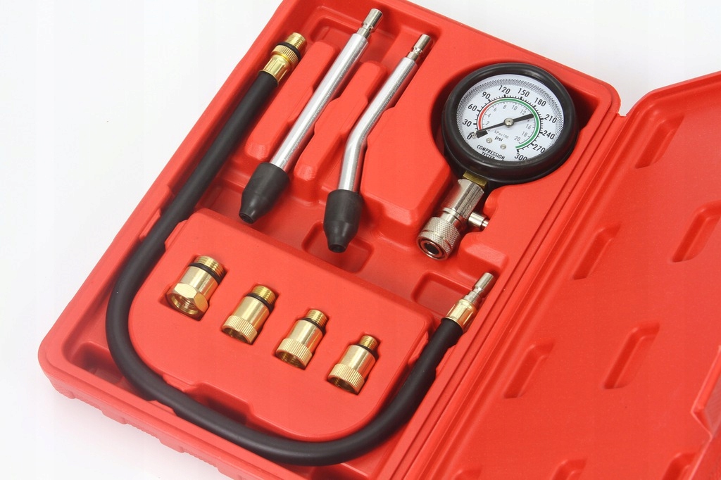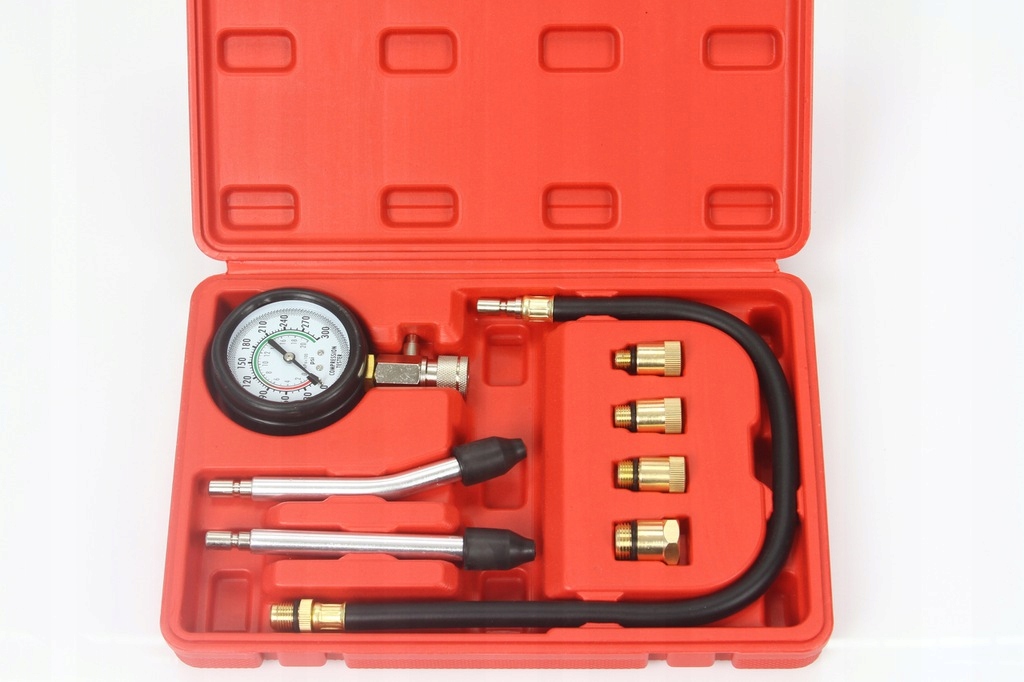 Tester do kontroli ciśnienia sprężania w cylindrach silników benzynowych z dodatkowymi elementami w zestawie poszerzającymi jego możliwości.