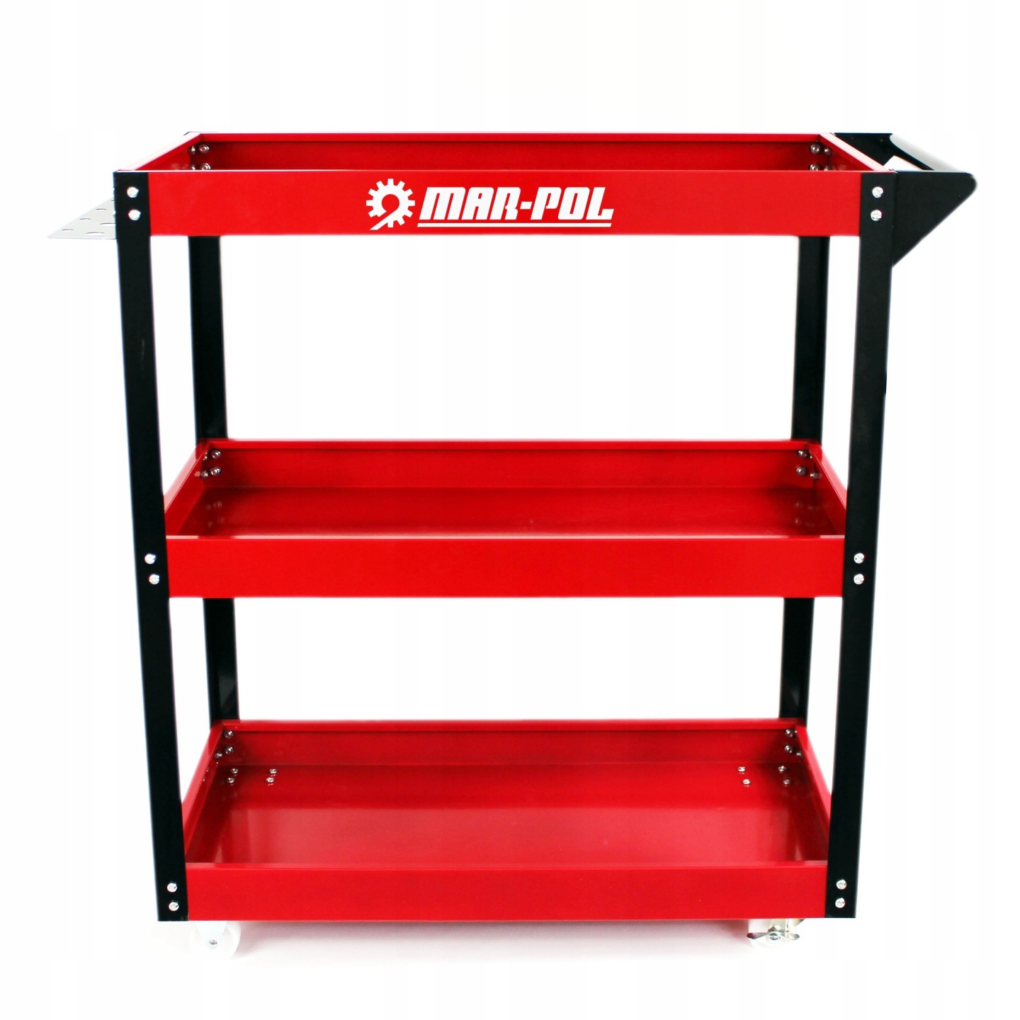 Stalowy wózek z trzema półkami. Idealnie nadaje się do warsztatów, serwisów, a także jest dobrym rozwiązaniem dla majsterkowicza. Ułatwia pracę, gdyż każde narzędzie masz zawsze pod ręką. Wyposażony został w cztery kółka dwa stała i dwa skrętne oraz metalową rączkę co ułatwia jego poruszanie. Wózek może służyć również do transportu niewielkich paczek.